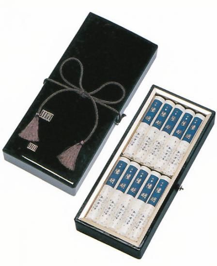 ![]() | ★進物用線香にはそれぞれ高級奉書、 水引や掛紙が付いております。 ★お線香を使い終わった後に外装箱を 有効的に再利用していただけますよう、 「源氏香の図」を裾模様として入れました。 |